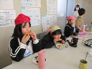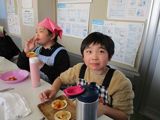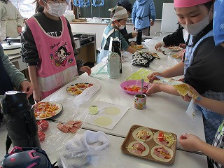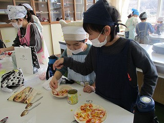 3・4年生は,ギョウザの皮を使って,ミニピザを作っていました。