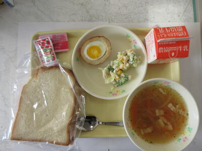山型食パン・スコッチエッグ・ブロッコリーサラダ・スコッチブロス・イチゴジャム・牛乳,です。
