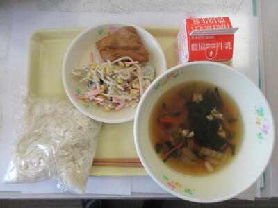 五目うどん・きつねもち・ごぼうとさきいかのサラダ・牛乳,です。