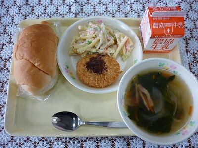 本日の給食は,バターロール,やわらかチキンカツ,マカロニサラダ,コンソメスープ,牛乳でした。