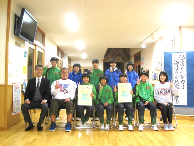 東北駅伝大会で,第2位入賞を果たした特設駅伝部の女子部員のみなさんが,無事に帰校しました。キャブテンの水菜さんをはじめ部員一人ひとりが,佐浦校長に大会の報告をしました。校長からも,部員に対する称賛と労をねぎらう言葉がかけられました。