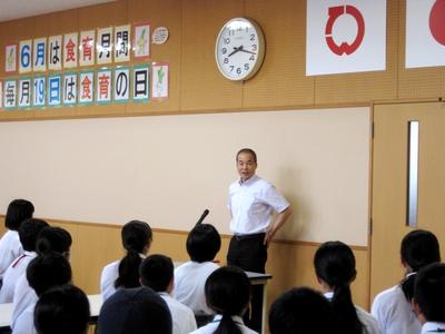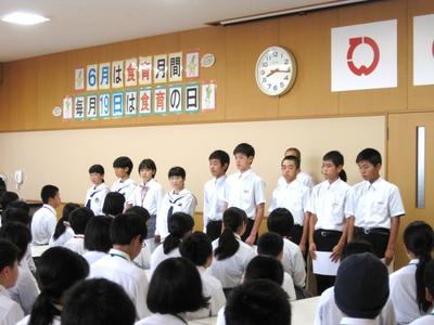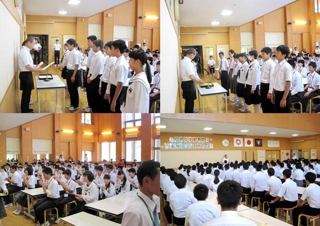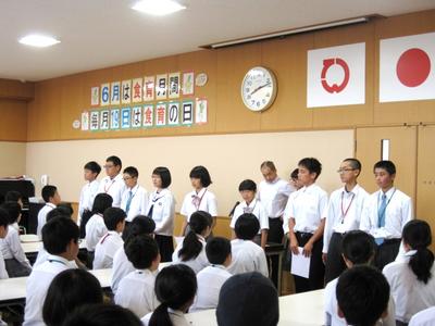 表彰後は馬場校長より,雨が多く寒い日が続いていて体調を崩している人もいるので,体調管理に気をつけてほしい。今週末に行われる,1・2年生の学習旅行,3年生の異文化体験学習に,みんなが楽しく参加できるようにしてほしいとのお話がありました。