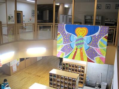 〔全校生徒で制作した,ちぎり絵のビックアート〕 〔吹奏楽部とロボットコンテストの全国出場を垂れ幕〕