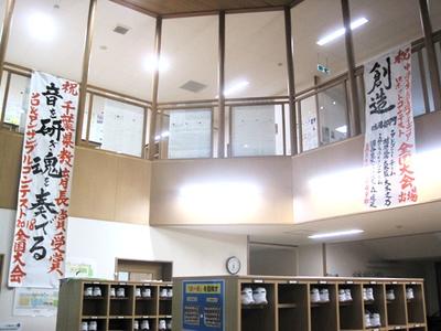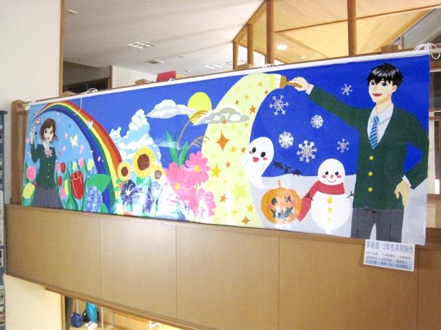 天栄中玄関のエントランスホールは,生徒の活躍を讃える佐浦校長直筆の垂れ幕,全校生徒で作成した校内文化祭のビックアート,美術部3年生の卒業制作などが飾られています。