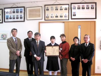 今日は,福島地方法務局郡山支局長様や人権擁護委員の皆様が来校され,人権作文コンテストへの取り組みが良かった本校に対して,感謝状を届けてくださいました。生徒を代表して,瑞姫さんが感謝状を受け取りました。