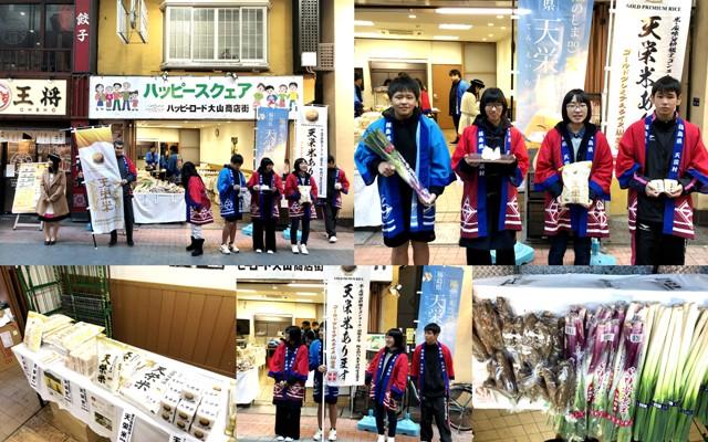 4名の生徒は,商店街を訪れた人に,漢方環境農法で栽培した日本一の天栄米や6次化商品のPRを行ったり,天栄米でつくったおにぎりを振る舞ったりしました。