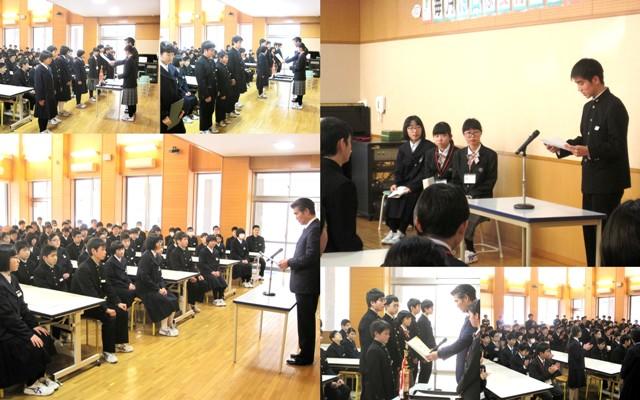 生徒の代表による新年の抱負では,生徒会役員と各学年代表生徒の発表がありました。どの生徒も,充実した内容で,立派に発表していました。それぞれの学年・学級で3学期の目標をしっかりと定めて,成長できる3学期にしていきましょう。