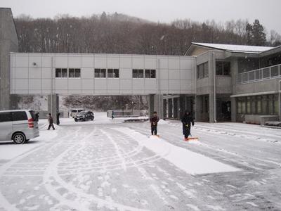 今朝は,あいにくの雪模様でした。天栄村は道路にも学校の敷地内にも積雪がありました。