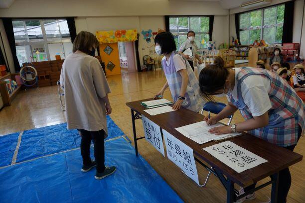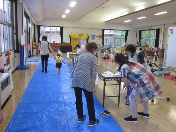 遊戯室で待機している園児たちは、緊張感をもって静かにお迎えを待っていました。