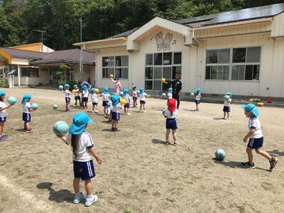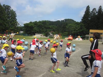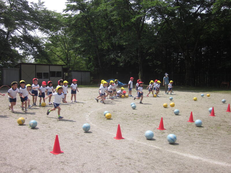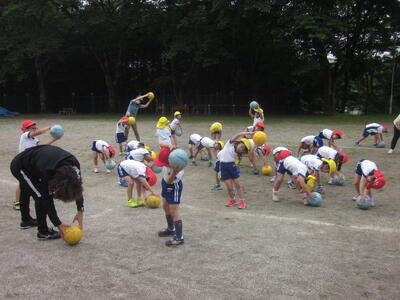 ボールを使った準備運動、「だるまさんが転んだ」応用バージョンのドリブル練習、そして宇宙人に見立てたコーンめがけてボールをけるゲームと、一つ一つがメリハリのある活動。湯本幼稚園のお友達と一緒に活動しました。楽しかったです。次回も楽しみです。
