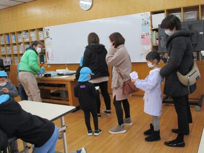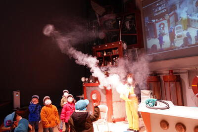 この日はクラス別に、「オリジナル缶バッチづくり」、「忍者スライムつくり」の2つの工作教室と「館内展示の見学そしてサイエンスショーの4つの教室を行いました。