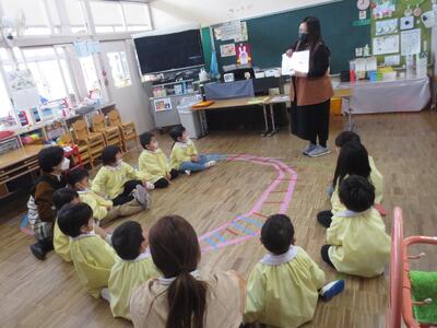 今日、年少組で今年度最後の英語教室を行いました。