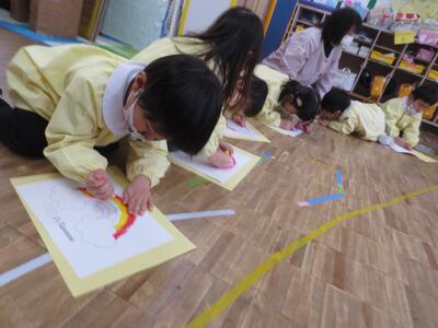 後半は、先生が準備してくれた塗り絵を塗りながら、好きな色を表現しました。ちなみに、そのプリントは子どもたちがクレヨンで好きな色を塗って完成させる「〇〇's rainbow」と個人名入りの虹の塗り絵です。