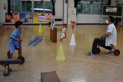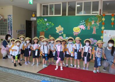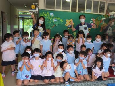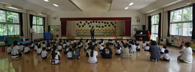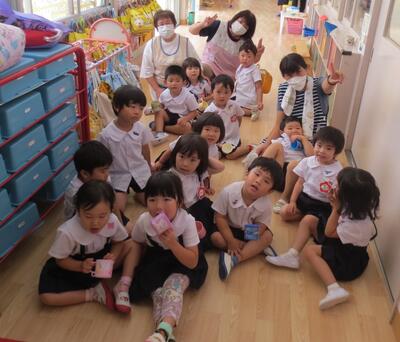 終業式では、園長から1学期たくさんのことができるようになったこと、みんなのめあて「みんななかよく、みんな元気に、お話を最後まで聞く、じぶんからする」を心がけて生活をすることができたことなど1学期の成果とともに、夏休みの約束として「早寝・早起き、道路では遊ばない、危ない場所には近づかない」の話がありました。