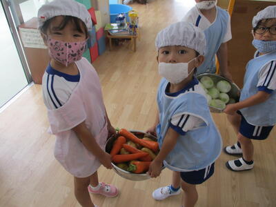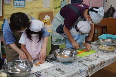 包丁の力加減や食材を持つ指を上手に丸めてカットする子もおり、日ごろお家で体験していることがうかがえました。