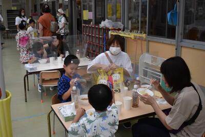 カボチャやトマト、いんげんなどの夏野菜が入ったカレーライスをみんなで「おいしいね」と言いながら食べました。今日、年長組は欠席者0だったので、実質上全員が完食したことになります。
