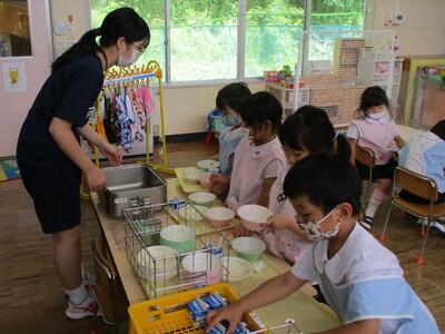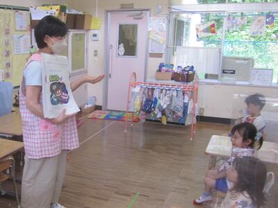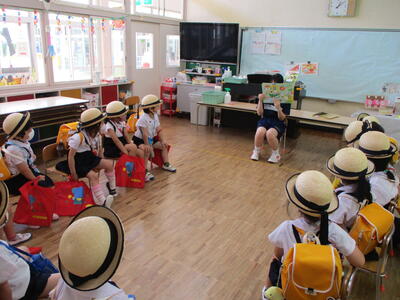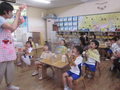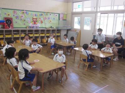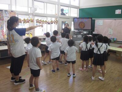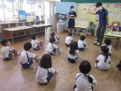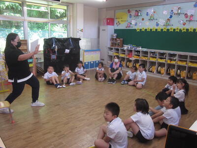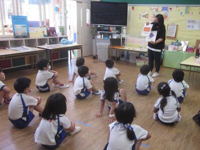 その初日、年長組の各クラスで英語教室を行いました。なお、年長組では一方のクラスが英語教室のとき、もう一方のクラスはプールでの水遊びを行いました。
