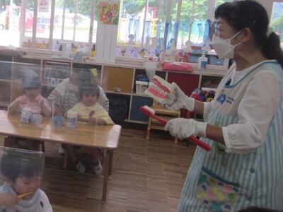 年少組の子どもたちも、先生のお話をうなずきながらちゃんと聞いて、歯磨きの練習をすることができました。