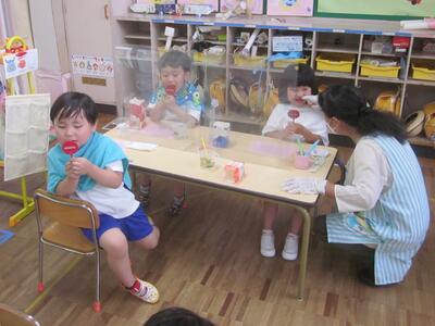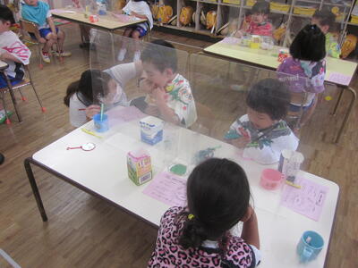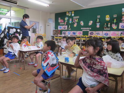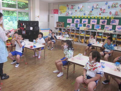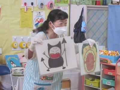 今年度も、市町村協力歯科衛生士のお二人においでいただき、正しい歯の磨き方を教えていただき、その後磨き残しのチェックを行いました。年長の子どもたちなのでだいぶ上手に磨くことができていました。