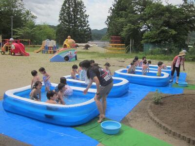 本日、天気も良好。今年度初のプール遊びを行いました。