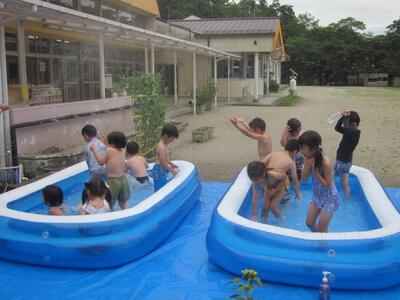 昨日歯科教室があった年長組は、今日からプールでの水遊びがスタートしました。