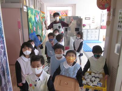 食器を返却する途中、声を合わせて「お残し無しです。」と言いながら職員室前までやってきました。