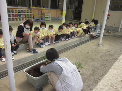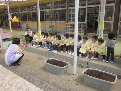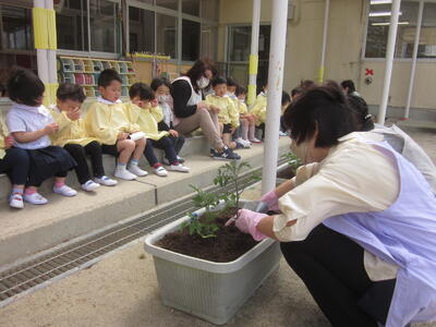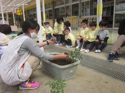 先日は年中組でスナップエンドウの苗を植え栽培活動をスタートさせましたが、本日年少組でプランターにミニトマトの苗を植えました。