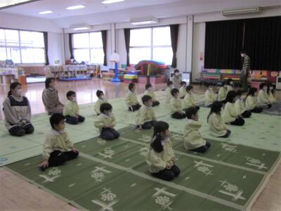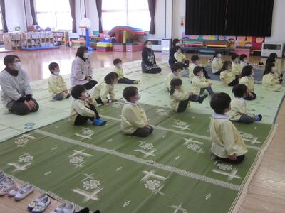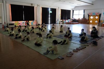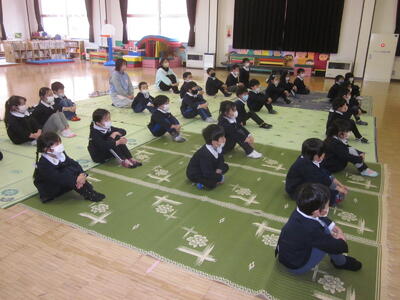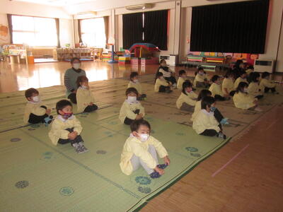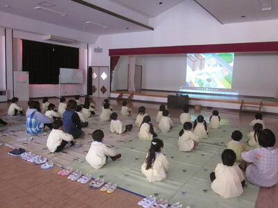 年少、年中、年長の各学年の子どもたち、間隔をあけ、体操お座りをして、しっかりと映像をみたり話を聞いたりすることができました。