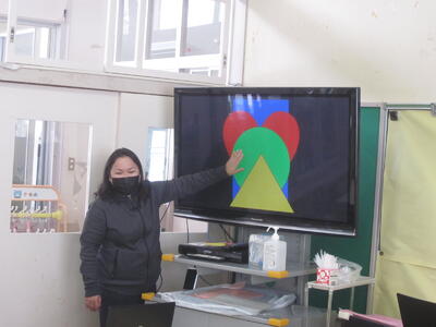 複数の図形を重ねた形を見、その形を自分でもつくって「rectangle、heart、circle、triangle !!」