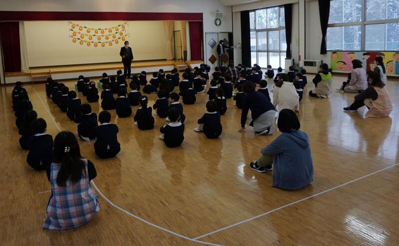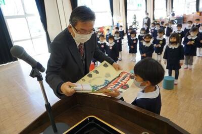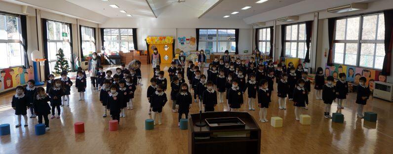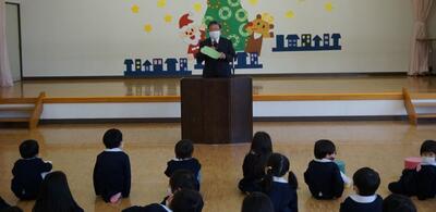 園長式辞では、2学期終業式で冬休みのお約束とした「道路への飛び出しはしない、早寝早起き、お家のお手伝いをする」について、みんなで大変よくできたことを確認しあいました。