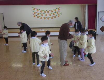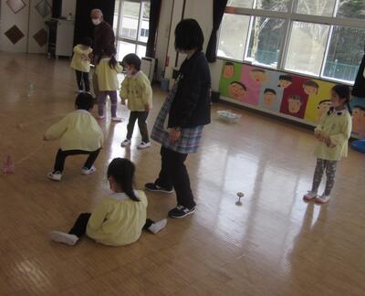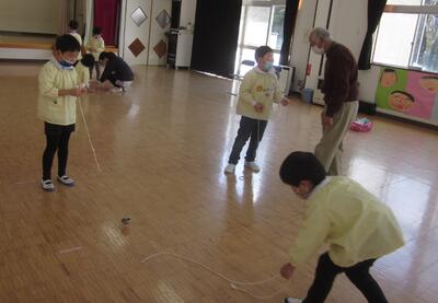 1月28日(金)開催の年長組コマ回し大会に向け、本日第1回目となる地域ボランティアさんのご指導によるコマ回しの練習会を開催しました。