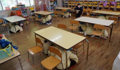 「地震です。地震です。身を守る行動をとりましょう。」の園内放送を受け、子どもたちは自らテーブルの下に入って地震がおさまるのを待ちました。