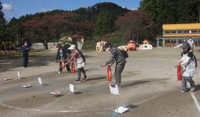 その後は、教職員を対象に水消火器を使って消火訓練を実施。