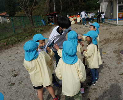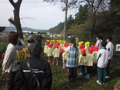 この日は、天栄中2年生が職場体験で来園しており、年長組のクラスに配属となった4名も子どもたちのさつまいも掘りをサポートしてくれました。