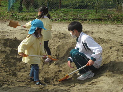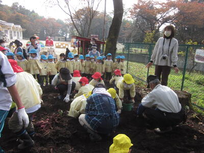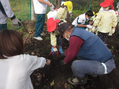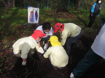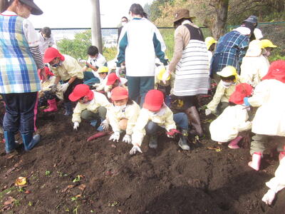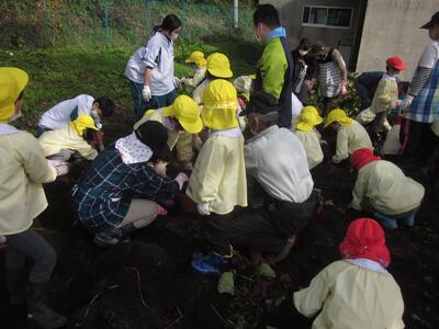 苗植え時にお世話になったボランティアの森内さんや星さんのご指導のもと、子どもたちがさつまいもほりを行いました。