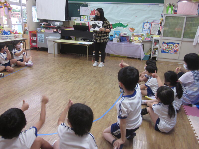 ハローソングをみんなで歌った後、前回の復習として、先生が示した動物の絵カードをみて「tiger、panda、・・・rhino」。