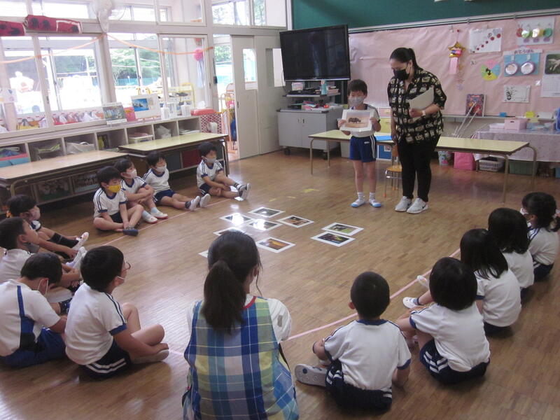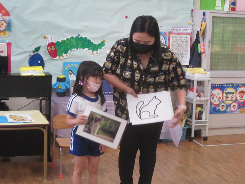 その後、先生の発音を聞いて、先生が言った動物の写真を手に取り、先生と一緒に発音する活動。多くの子どもたちが発音だけで、その動物の写真を選んでいました。前回よりも、少しレベルアップです。