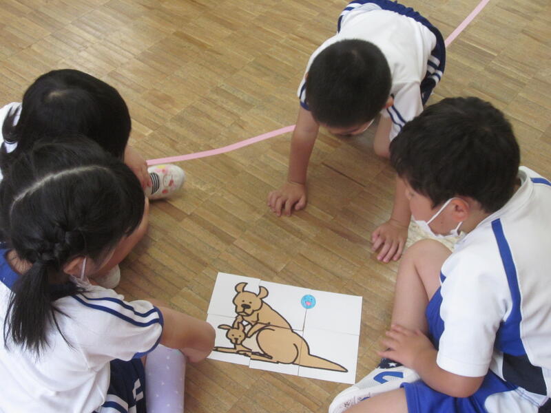 最後は、4~5ピースに分けた動物の絵を完成させて、「It's a 〇〇!」