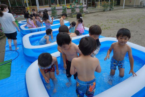 年中組、年長組は、短時間でしたが雨のタイミングの関係で、初プールに入ることができました。子どもたちの歓声を聞くことができよかったです。