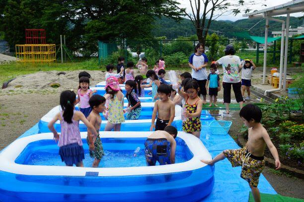 年少組が入ろうとしたタイミングで霧雨が降ってきたので、プールに足を入れてその感触をクラスみんなで味わう程度の活動になってしまったのが残念でしたが次回に期待。