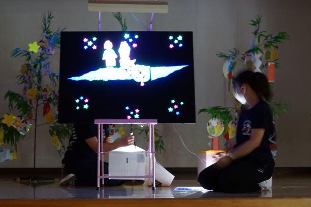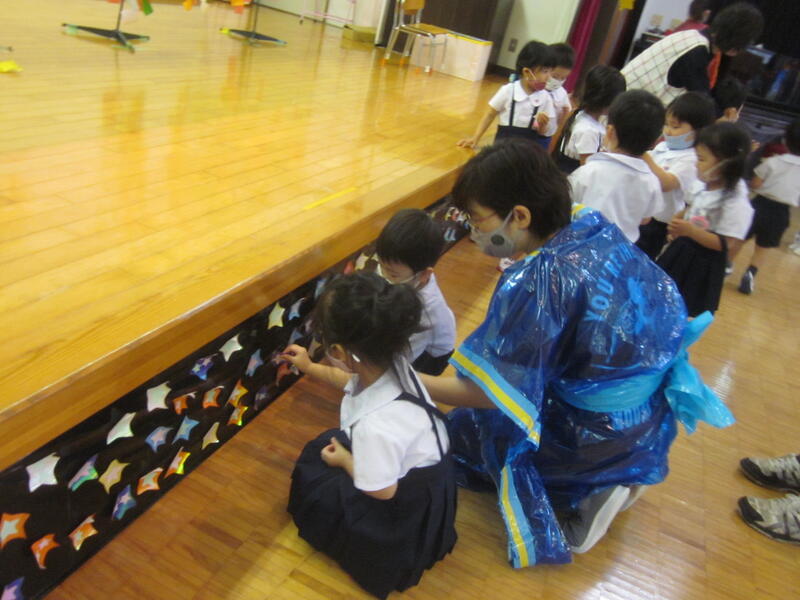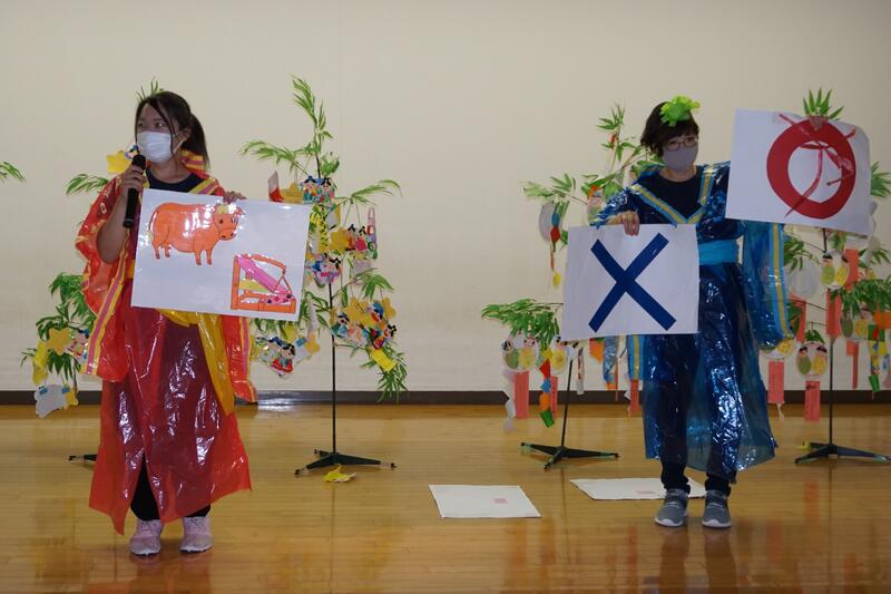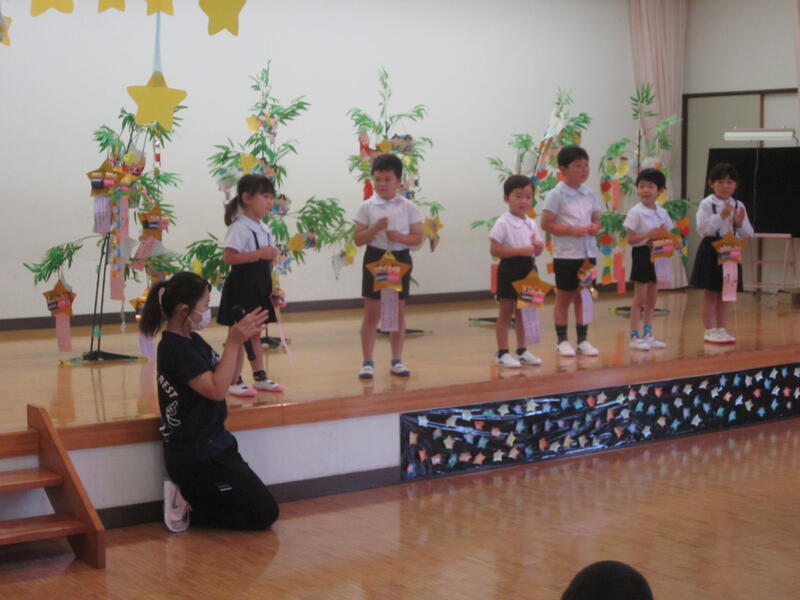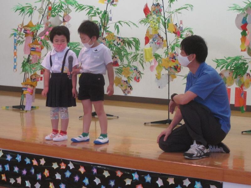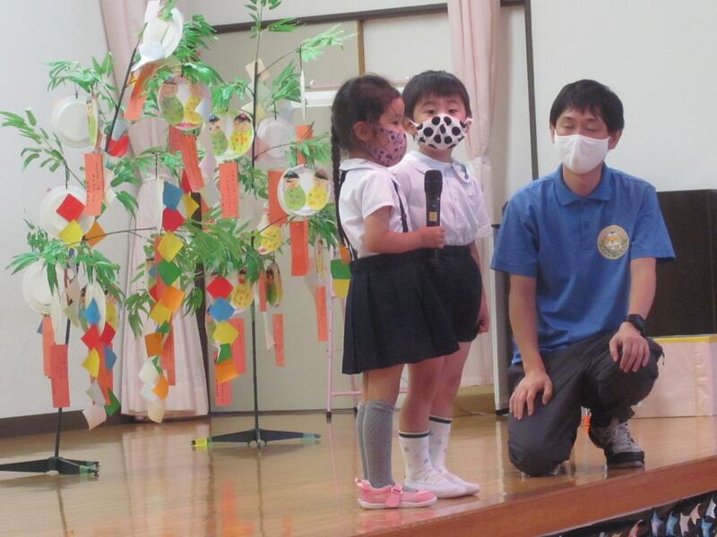 ステージ上に飾られた願いを紹介したり、年長組代表が自分の願い事を紹介したりしました。