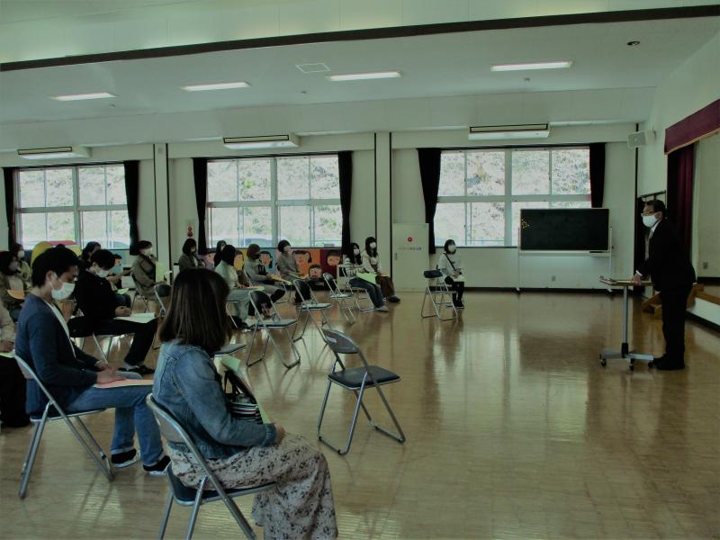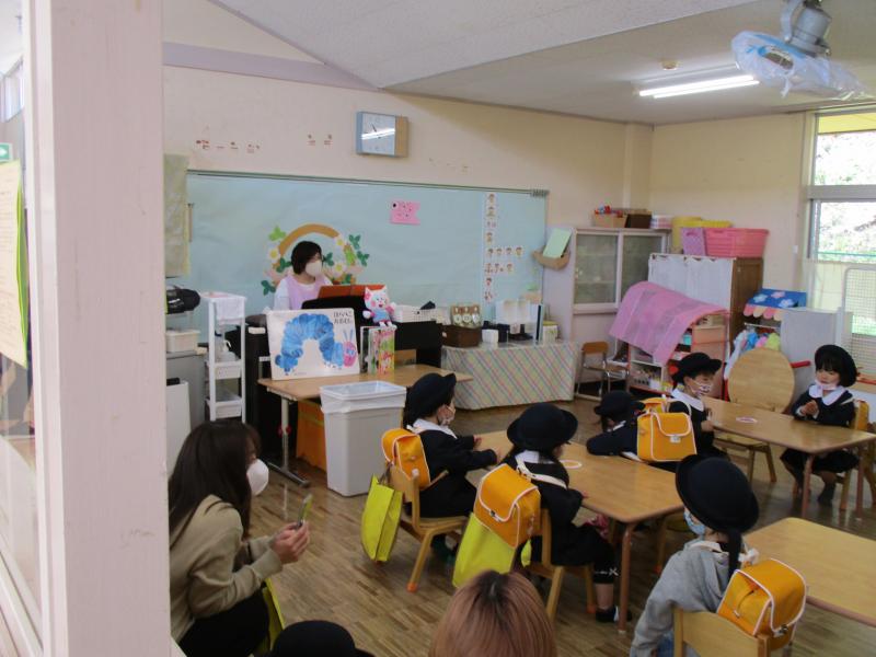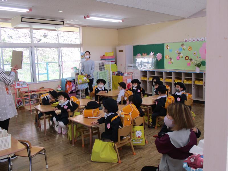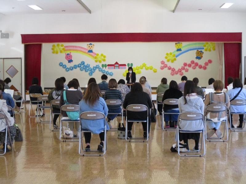 今回、密を避けるために参観者は園児一人につき保護者一人とするとともに、出席番号の奇数・偶数の2つのグループに分け、保護者参観と遊戯室での園長挨拶・PTA総会要項概要説明会の2部制で行いました。