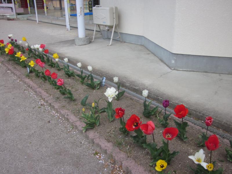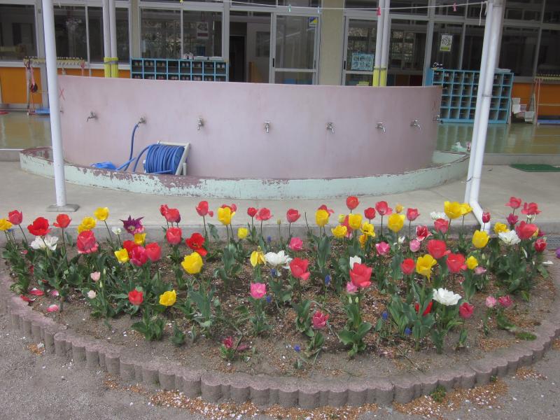 花壇のチューリップなどは、昨年秋、その当時の年少、年中、年長の子どもたちが、今度の春に入園するお友達のためにと植えた球根が、開花したものです。