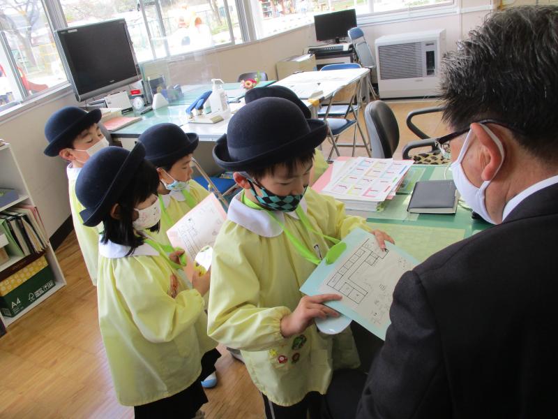 職員室では、園長の「(あなたの)お名前は?」に「〇〇 〇〇です。」としっかりこたえていました。