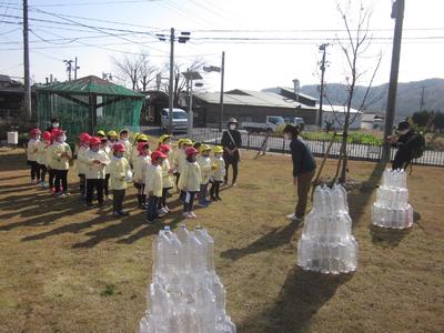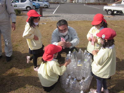 今日は園児たちが短冊に描いた絵を、村社会福祉協議会のボランティアの方々のサポートをいただきながら、飾られるイルミネーションとなるペットボトルに入れました。