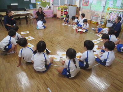 3種類のフルーツ(イラスト)を一人ずつ先生からもらうのですが、子どもたちは先生が英語表現をしたフルーツを取らなければなりません。ここに子どもたちのチャレンジがありました。