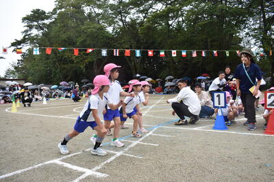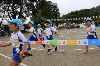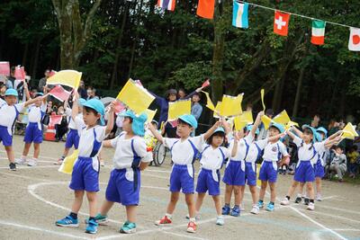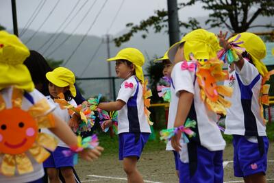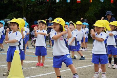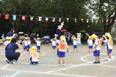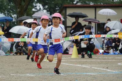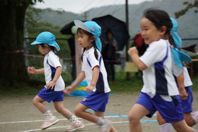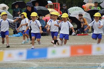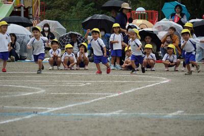 天候への対応として、急遽園児の待機場所を園庭テントの中から教室に変更したり、プログラムを調整したりして進めた今年度の運動会でしたが、どの学年も子どもたちが練習の成果をしっかりと発揮し、伸び伸びとかけっこやリズムの姿を見せてくれました。その子どもたちの姿に多くのみなさんが感動の涙。