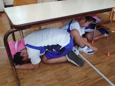 地震発生の園内放送を受け、全園児がテーブルに下で落下物に備えました。