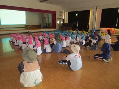 全員避難完了後、遊戯室に移動して、全員で地震時の避難に関するDVDを視聴しました。