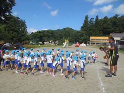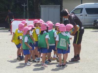 そして、年長組の後半は、ビブスをつけて5分間のミニゲーム。途中一斉に水分補給タイムも取り、熱中症対策も。
